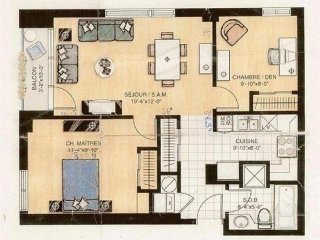 | Chambre à coucher | 9.10 x 9 P | AU | Bois |